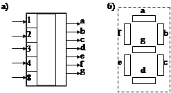 На рис 8.12.а показана микросхема типа КМ555ИД18, на вход которой подводится код одного разряда с выхода АЦП с «весами» 8-4-2-1, а выход микросхемы представлен контактами с буквенным обозначением a,b,c,d,e,f,g. Такое же обозначение имеют и входные лепестки семисегментной микросхемы ЦОУ.