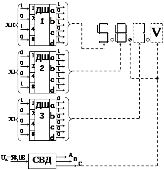 На рис.8.13 показано соединение дешифраторов и СВД с семисегментными n/n преобразователями при измерении напряжения Ux = 58,1В.