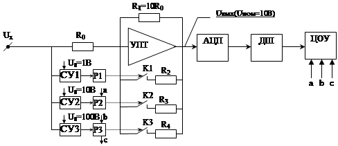 Схема вольтметра имеет три сравнивающих устройства (СУ1, СУ2 и СУ3), к каждому из которых подключены соответственно образцовые напряжения U01 = 1B, U02 = 10B и U03 = 100B.