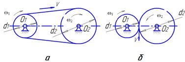 Рис.3.12. Схемы плоскоременной (а) и цилиндрической зубчатой (б)