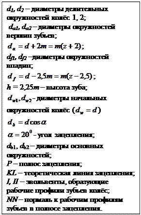 Активная часть эвольвентных профилей зубьев на рисунке заштрихована. Высота зуба h определяется радиальным расстоянием между окружностями вершин da и впадин df, которые отстоят от делительной окружности в большую и меньшую стороны соответственно на величину модуля зацепления m и 1,25 m.