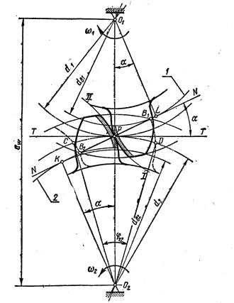 Линия зацепления касается основных окружностей колёс в точках К и L и образует угол зацепления α = 200 с перпендикуляром к линии центров в полюсе зацепления р (общая касательная к делительным окружностям колёс). Отрезок KL называется теоретической линией зацепления, а его часть В1В2, где реально пробегает точка зацепления при вращении колёс, - называется рабочей частью линии зацепления.