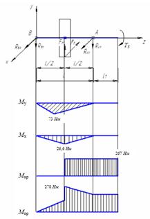 По принятым значениям диаметров валов выбирают по ГОСТ подшипники и выполняют эскизную компоновку редуктора с целью предварительного определения геометрических размеров валов. Необходимые для построения эскиза размеры принимаются по результатам выполненных выше расчетов зубчатой передачи и выходных концов валов редуктора. По методологии сопротивления материалов определяются опорные реакции, рассчитываются и строятся эпюры внутренних силовых факторов - изгибающих и крутящих моментов в поперечных сечениях (рис.3.16).