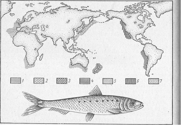 1 — Sardina pilchardus pilchardus; 2 — S. p. Sardina; 3 — Sardinops sagax sagax; 4 — S. S. neopilchardus; 5 — S. s. ocellata; 6 — S. s. caerulea; 7 — S. s. melanosticta.