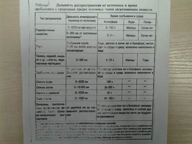 Как правило,люди и природные объекты одновременно подвергаются воздействию нескольких загрязняющих веществ.Чтобы учесть их совместное действие,рассчитывается общий уровень загрязнения S как сумма относительных уровней загрязнения по каждому из них S=ΔSi.В настоящее время нормой считается,если выполняется условие S<=1.Этот подход предполагает,что загрязняющие вещества действуют независимо друг от друга.Проблема состоит в том, что при одновременном воздействии нескольких веществ возможен синэргетический эффект,состоящий в том, что совместное действие нескольких веществ больше суммы по отдельности, поэтому при одновременном присутствии нескольких загрязнителей,ПДК по каждому из них должен быть снижен.Опасность исходящая от загрязняющего вещества зависит не только от характера его воздействия,но и от величины эмиссии (выброса в окружающую среду),но и от параметров его распространения.Пространственный масштаб распространения загрязния зависит от того,в какую среду оно попало и от времени жизни загрязняющего вещества.В атмосфере загрязняющие вещества разносятся ветрами со скоростью 1-20 м\с (4-70 км\ч) Под временем пребывания в данной среде будем понимать время,за которое концентрация вещества становится меньше предельно допустимой концентрации.В таблице 5.4 приведены типичные масштабы пространственного распространения загрязняющих веществ и времена их пребывания в природных средах