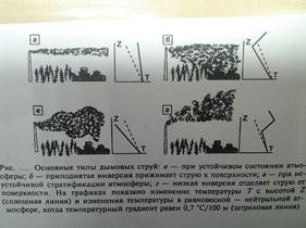 Особую роль играют температурные инверсии.Если слой тёплого воздуха располагается над слоем холодного,а граница между этими слоями выше источника,то такая приподнятая инверсия зажимает примесь у поверхности замли. При слабом ветре имеси скапливаются у источника- это самая неблагоприятная ситуация. Когда источник выше инверсионного слоя,то примесь распространяется вверх.Это одна из основных причин строительства высоких труб