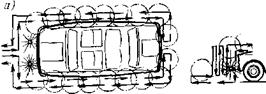 Моечную и сушильную установки располагают совместно.в зависимости от имеющейся площади и способа сушки автомобиля. Площадь, необходимую для размещения установок, уменьшают путем сокращения длины их перемещения или путем их взаимного расположения: последовательно (рис. 6.1,6) или под углом одна к другой (рис. 6.1,б). Установки могут быть расположены и раздельно независимо одна от другой. Однако в каждом случае рекомендуется размещать установки так, чтобы они обслуживались одним и тем же рабочим.