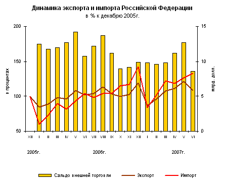 1. В I полугодии 2007г. внешнеторговый оборот России составил, по данным Банка России, 252,8 млрд.долларов США (118,3% к I полугодию 2006г.), в том числе экспорт - 157,2 млрд.долларов (109,3%), импорт - 95,5 млрд.долларов (136,8%). Сальдо торгового баланса оставалось положительным, 61,7 млрд.долларов США (в I полугодии 2006г. - 74,1 млрд.долларов).