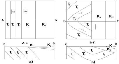 Рис. 2. Геологическая карта и профиль а) углового; б) азимутального несогласия.