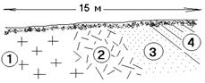 Явное несогласие – несогласие с отчетливо и резко выраженной поверхностью несогласия. Скрытое – с неопределенным положением поверхности несогласия. Так, например, к югу от Донецкого каменноугольного бассейна в обнажениях по р. Кальмиус (рис. 3) на размытой поверхности докембрийских гранитов непосредственно залегают отложения среднего девона (3, 4). Граниты (1) сохраняют массивное сложение в основании разреза, а вблизи кровли сильно разрушены и выражены рыхлым элювием (2). Выше разрушенные граниты постепенно переходят в грубый аркозовый песчаник (3), который, в свою очередь сменяется более тонким, лучше отсортированным песчаником, внизу лишенным слоистости, а вверху со слоистостью (4).