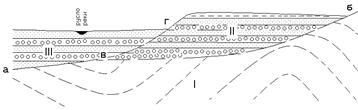 Рис. 4. Несогласное прилегание аллювиальных отложений к коренным породам (а-в-б) и согласное прилегание аллювиальных отложений поймы к аллювиальным отложениям террасы (в-г). I – коренные породы; II – отложения террасы; III – отложения поймы. |