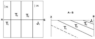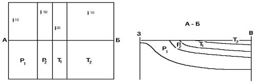 Рис. 1. Геологическая карта и разрез моноклинально залегающей толщи. |
