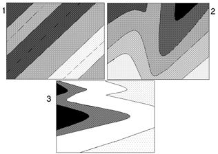Рис. 2. Сочетание складчатых форм: 1 – параллельное; 2 – кулисообразное; 3 – виргация.