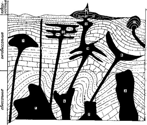 Рис. 1. Формы магматических тел: 1 – батолит; 2 – бисмалит; 3 – шток; 4 – этмолит; 5 – дайка; 6 – жила; 7 – лакколит; 8 – лополит; 9 - факолит; 10 – пластовая залежь – силл; 11 – купол; 12 – лавовый очаг; 13 – некк; 14 – лавовый обелиск; 15 и 16 – лавовые потоки