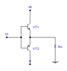 В режиме покоя оба транзистора заперты, поскольку напряжения на эмиттерных переходах равны нулю. Во время положительной полуволны входного сигнала Ui открывается транзистор VT1, а во время отрицательной полуволны- транзистор VT2. Коэффициент усиления по мощности определяется отношением эмиттерного и базового токов, т.е. практически равен коэффициенту h21.