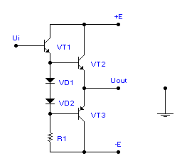 Cледующая схема построена на однотипных транзисторах. В ней транзистор VT2 открыт в течении обоих полупериодов. В режиме покоя ток транзистора выбирается так, чтобы потенциал коллектора VT2 был равен нулю. При этом диод VD1 и транзистор VT1 заперты, ток в нагрузке отсутствует. Во время положительной полуволны входного сигнала потенциал коллектора VT2