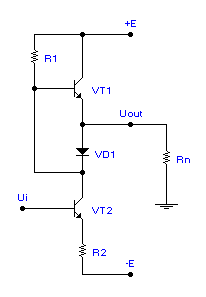 уменьшается, при этом открывается диод VD1 и через нагрузку начинает протекать ток. Транзистор VT1 остается закрытым, т.к. прямое напряжение на диоде создает на эмиттерном переходе обратное смещение. Во время отрицательной полуволны потенциал коллектора VT2 повышается, отпирается транзистор VT1 и через нагрузку протекает ток, обусловленный транзистором VT1. При этом диод заперт, т.к. прямое напряжение на эмиттерном переходе создает на диоде обратное смещение.