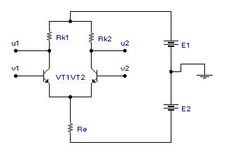 Схема составлена таким образом, что является симметричной, т.е. транзисторы VT1 и VT2 одинаковы по всем характеристикам и параметрам, Rk1=Rk2, Re>>Rk, E1=E2. Схема имеет два входа v1 и v2 и два выхода u1 и u2. При анализе работы схемы рассматриваются два варианта подачи сигналов: v1=v2 (синфазный входной сигнал) и v1=-v2 (дифференциальный входной сигнал). В первом случае очевидно, что u1=u2, и изменение напряжения на коллекторах много меньше изменения напряжения на эмиттере, соотношение между этими напряжениями такое же, как между сопротивлениями резисторов Rk и Re. Поскольку напряжение сигнала на эмиттерной нагрузке практически равно напряжению сигнала на входе каскада, можно утверждать, что в данном случае изменение напряжения на каждом коллекторе оказывается много меньше величины входного сигнала, т.е. коэффициент усиления в данном случае много меньше единицы.