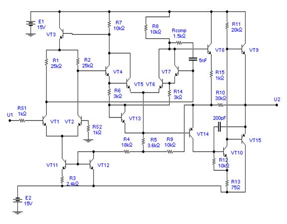 Выходной каскад выполнен на транзисторах VT9, VT15, каждый из которых представляет собой эмиттерный повторитель, а вместе они образуют так называемую двухтактную схему выходного каскада, в котором верхний транзистор передает во внешнюю нагрузку положительную полуволну усиленного сигнала, а нижний- отрицательную.