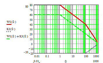 Рассмотрим один из вариантов частотной коррекции, используя график, приведенный ниже. На графике приведены: исходная ЛАЧХ ОУ, обозначенная