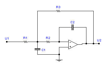 Фильтр нижних частот второго порядка (ФНЧ-2) на основе интегратора. Схема состоит из последовательно включенных цепи R1C1 и интегратора с элементами R2C2. Кроме того, в схеме действует общая обратная связь через резистор R3.