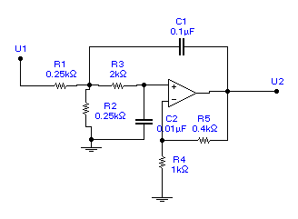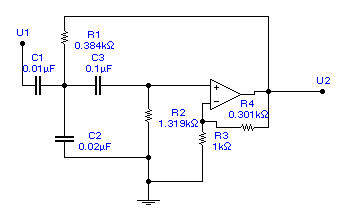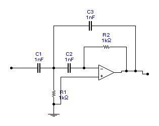 Схема такого фильтра получается из схемы на основе интегратора путем замены резисторов конденсаторами, а конденсаторов резисторами. Пример реализации такой схемы имеет вид