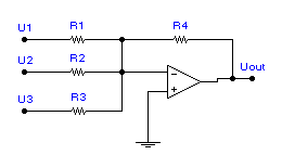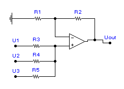 Выходное напряжение в этой схеме Uout определяется падением напряжения на резисторе R4, которое, в свою очередь, равно произведению суммы токов, протекающих через резисторы R1, R2 и R3 на сопротивление R4: Uout= -(U1/R1+U2/R2+U3/R3)R4. При условии, что R1=R2=R3=R4 получаем Uout=-(U1+U2+U3). Очевидно, что полученный результат справедлив для произвольного числа входов.