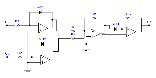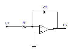 В этой схеме к диоду приложено напряжение U1, следовательно, выходное напряжение, определяемое произведением тока через диод на сопротивление R, равно: