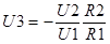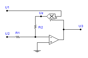 В этой схеме перемножитель включен в цепь отрицательной обратной связи ОУ, его выходное напряжение Uz=U1U3. Под действием этого напряжения через резистор R2 протекает ток i2=Uz/R2, который, с учетом нулевого потенциала на инвертирующем входе, должен быть равен и противоположно направлен току через резистор R1, i1=U2/R1. Таким образом, приходим к выводу, что справедлива формула Uz/R2=-U2/R1. С учетом того, что Uz=U1U3, получаем