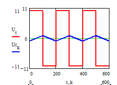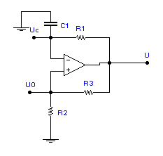 Из временной диаграммы видно, что положительному напряжению на выходе схемы соответствует участок линейного нарастания напряжения на конденсаторе (начальный участок экспоненты) вплоть до уровня U0, а при скачкообразной смене полярности выходного напряжения наблюдается линейное уменьшение напряжения на конденсаторе до уровня -U0. Очевидно, что увеличение уровня U0 приведет к увеличению периода колебаний и наоборот.