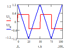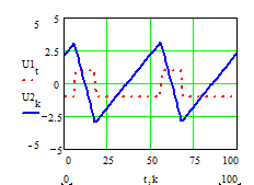 Данная схема состоит из интегратора на операционном усилителе А1 и компаратора на операционном усилителе А2. Выходное напряжение компаратора поступает через резистор R3 на последовательно включенные стабилитроны D2 и D3, которые обеспечивают ограничение напряжения как положительной, так и отрицательной полярности на заданном уровне, формируя таким образом входной сигнал интегратора. Как видно из схемы, входной сигнал интегратора в зависимости от его полярности проходит или через резистор R1 (отрицательная полярность), или через оба резистора R1 и R2 (положительная полярность). За счет этого положительный фронт сигнала на выходе интегратора имеет большую длительность, чем отрицательный. Переключения компаратора происходят в моменты времени, когда напряжение положительной обратной связи компаратора на резисторе R4 уравновешивается напряжением на выходе интегратора U2. График временной диаграммы для данной схемы приведен ниже.
