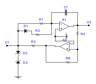 Для получения сигнала с различными длительностями участков нарастания и убывания напряжения используются схемы, в которых постоянная времени интегратора автоматически изменяется при смене полярности входного сигнала. Примером такой схемы является следующая.