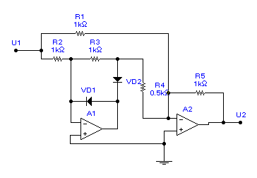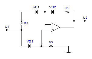 В отрицательный полупериод диод VD3 закрыт и усилитель работает, как инвертирующий с коэффициентом передачи равным -1. Недостатком схемы является недостаточная точность из-за влияния нелинейности вольт-амперных характеристик диодов и различия коэффициентов усиления ОУ по инвертирующему и неивертирующему входам. Более точной является схема на двух ОУ.