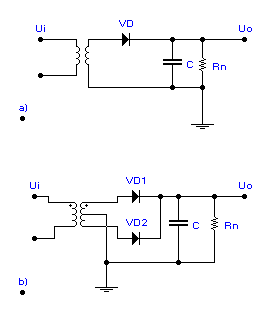 Выпрямительные устройства используются для преобразования переменного напряжения в постоянное. Выпрямительное устройство обычно состоит из полупроводниковых диодов, осуществляющих преобразование переменного напряжение синусоидальной формы в пульсирующее однополярное напряжение, которое с помощью фильтра преобразуется в постоянное напряжение. Используются схемы однополупериодных и двухполупериодных выпрямителей, примеры которых приведены ниже.