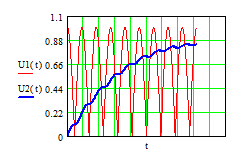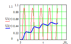 Однополупериодная схема (рис.а) применятся при выпрямленных токах до нескольких десятков миллиампер и в тех случаях, когда не требуется высокой степени сглаживания выпрямленных напряжений. Эта схема характеризуется низким коэффициентом использования мощности трансформатора. Двухполупериодный выпрямитель со средним выводом вторичной обмотки трансформатора (рис.b) позволяет вдвое увеличить постоянную составляющую и уменьшить уровень пульсаций. На приведенных ниже графиках показаны переходные процессы установления выходного напряжения для однополупериодной и двухполупериодной схем. Как видно, двухполупериодная схема имеет преимущество по величине постоянного выходного напряжения и по уровню пульсаций.