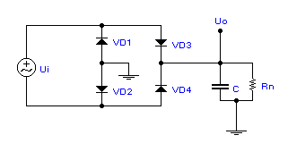 В этой схеме в положительный период напряжения Ui ток в нагрузку Rn течет по направлению от “плюса” источника Ui через диод VD3, нагрузку, далее через “землю” и диод VD2 на “минус” источника Ui. В отрицательный полупериод сохраняется то же направление тока через нагрузку Rn за счет протекания тока от “плюса” к “минусу” по пути диод VD4, нагрузка, “земля”, диод VD1, “минус” источника Ui.