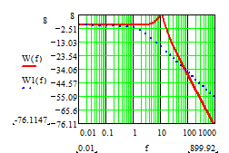 Другим преимуществом LC фильтра по сравнению с Г-образным RC фильтром является большая крутизна среза его ЛАЧХ, что иллюстрируется следующим графиком, на котором W(f) и W1(f) соответственно, ЛАЧХ Г-образных LC и RC фильтров.