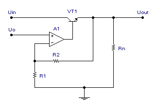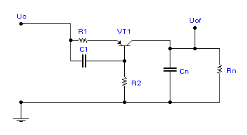 На вход схемы поступает напряжение Uo, содержащее постоянную составляющую, и напряжение пульсаций, амплитуда которых много меньше постоянной составляющей. Режим работы транзистора по постоянному току (положение рабочей точки) задается с помощью резисторов R2 (базовый ток) и R1 совместно с Rn (суммарная нагрузка эмиттера и коллектора). Положение рабочей точки выбирается так, чтобы разность напряжений постоянной составляющей Uo-Uof была минимальной, но режим работы транзистора для флуктуационной составляющей оставался бы линейным. При соблюдении этих условий флюктуации напряжения относительно рабочей точки практически не будут влиять на величину коллекторного тока, который определяет напряжение на нагрузке. Цепочка R1C1 обеспечивает постоянство тока эмиттера при кратковременных изменениях тока нагрузки и должна иметь большую постоянную времени.