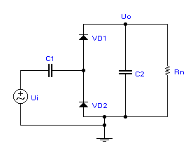 Позволяют получить постоянное напряжение в несколько раз больше переменного напряжения источника питания. Принцип действия таких схем рассмотрим на примере выпрямителя с удвоением напряжения. Схема работает следующим образом: в положительный полупериод напряжения Ui конденсатор С1 заряжается через открытый диод VD1. В следующий полупериод диод VD1 будет закрыт, но откроется диод VD2 и ток заряда потечет через конденсатор С2, при этом зарядное напряжение будет равно сумме Ui+UC1. В результате за несколько периодов входного напряжения конденсатор С1 зарядиться до амплитудного значения Ui, а конденсатор С2 зарядиться до его удвоенного значения. Каскадное наращивание рассмотренной схемы дает возможность увеличить выпрямленное напряжение в еще большее число раз. В качестве примера рассмотрим схему с четырехкратным умножением напряжения. Как видно, она образована путем каскадного соединения схем удвоения напряжения и работает аналогично. Время установления выходного напряжения увеличивается пропорционально коэффициенту умножения.