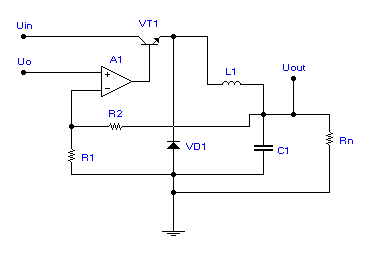 -напряжение, приложенное к индуктивности. Ток через катушку индуктивности заряжает конденсатор С1, который соединен с неинвертирующим входом усилителя А1 и подает ток в нагрузку Rn. Выходное напряжение увеличивается до тех пор, пока напряжение на инвертирующем входе не превысит уровня опорного напряжения Uo. В этот момент напряжение на выходе усилителя меняет полярность и транзистор VT1 запирается. Энергия, запасенная в катушке индуктивности, служит причиной возникновения импульса напряжения отрицательной (со стороны диода) полярности, диод VD1 открывается и через нагрузку течет ток, противоположный току разряда конденсатора С1. Когда этот ток сделается меньше тока разряда конденсатора, и напряжение на инвертирующем входе сделается ниже опорного, Усилитель включит транзисторный ключ и цикл повториться. Выходное напряжение ключевого стабилизатора колеблется около напряжения Uout =Uo(R1+R2)/R2 с амплитудой, которая тем меньше, чем больше коэффициент усиления усилителя.