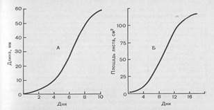 А — увеличение длины междоузлия у фасоли; В — рост листа огурца.