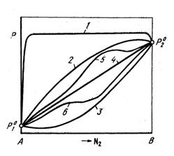 Кривые 2 и 3 характеризуют расплавы с положительными (2) и отрицательными (3) отклонениями от закона Рауля. Кривая 4 относится к идеальным растворам, для этого случая p1 = p10N1ж (РА = Р0АХжА) и р2 = p20N2ж (РВ = Р0ВХжВ), степень разделения описывается соотношением:
