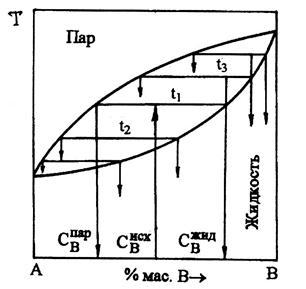 На рис. 6.8 представлена фазовая диаграмма состояния системы А-В в координатах Х-Т. При нагреве исходной жидкости до температуры t1 часть жидкости испарится, обогатится легкокипящим компонентом А, а жидкая фаза - высококипящим компонентом В. Если пар охладить до температуры t2, то он частично сконденсируется, а оставшаяся паровая фаза еще более обогатится компонентом А. Для разделения жидкой фазы ее необходимо нагреть до t3. При более высокой температуре часть жидкости испарится, а оставшаяся жидкость обогатится высококипящим компонентом В.