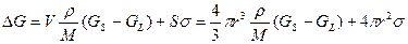 Пусть GL и GS. молярные энергия Гиббса жидкого и твердого металла при температуре плавления (затвердевания). Объем зародыша обозначим V, а его поверхность - S и поверхностное натяжение на границе жидкость – зародыш - σ. Изменение свободной энергии при образовании зародыша, представляющего собой сферу радиусом r, складывается из двух частей, характеризующих появление зародыша объема V и образования и увеличения поверхности раздела S.