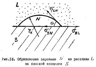 Допустим, образование зародыша происходит из расплава на плоской поверхности. Работа образования зародыша критического размера ∆Gкр. может быть найдена из уравнения