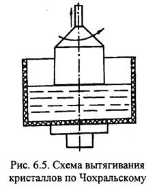 Очистка металла может производиться путем вытягивания монокристалла из расплава по Чохральскому. При этом способе кристаллизация металла происходит на затравке, вращающейся вокруг оси (рис. 6.5).