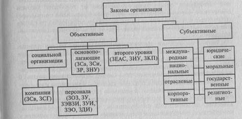 Объективные законы, отражающие связь элементов в системе организационных отношений, именуют законами организации. Различают три типа (группы) законов организации: общие, или социальной организации, отражающие процессы формирования и развития компаний (законы своеобразия — ЗСв и социальной гармонии — ЗСГ) и жизнедеятельности персонала (законы оптимальной загрузки — ЗОЗ, эффективного восприятия и запоминания информации — ЗЭВЗИ, эффективного осмысления — ЗЭО, установки — ЗУ, устойчивости информации — ЗУИ и доходчивости информации — ЗДИ); основополагающие (законы самосохранения — ЗСа, развития — ЗР, синергии — ЗСи и наименьшей устойчивости — ЗНУ) и законы второго уровня, или «фоновые» (единства анализа и синтеза — ЗЕАС, информированности — упорядоченности — ЗИУ, композиции — пропорциональности - ЗКП).