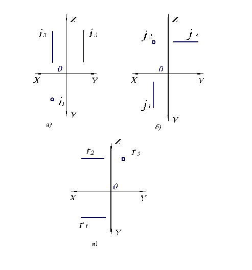 У проецирующих прямых две проекции параллельны плоскостям проекций. Поэтому i 2, i 3, j 1, j 3, r 1, r 2 – это натуральные величины соответствующих прямых i, j, r.