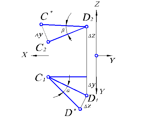 На нем, отложив отрезок длиной Dz, получим точку D*. После соединения точек D* и С 1 получаем прямоугольный треугольник С 1 D 1 D *, в котором С 1 D * - натуральная величина отрезка СD, a - угол наклона отрезка СD к плоскости П 1. Для определения угла наклона к плоскости П 2 проведем аналогичные построения на фронтальной проекции. Здесь С*D 2 – натуральная величина СD, b - угол наклона СD к плоскости П 2.