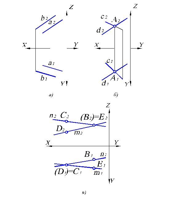 Рис. 1.12. Двухкартинный комплексный чертеж прямых, занимающих по отношению друг к другу следующее положение: а) а êêb; б) с Ç d; в) n ¸ m